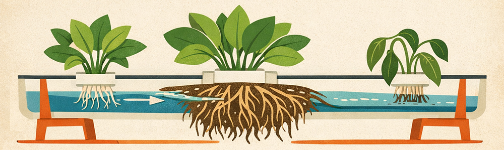 Plants grow in foam rafts (typically expanded polystyrene) floating on nutrient-rich water. Roots hang directly into the water where they absorb dissolved nutrients and oxygen. Water from fish tanks flows continuously through raft beds, providing constant nutrient delivery and water exchange.