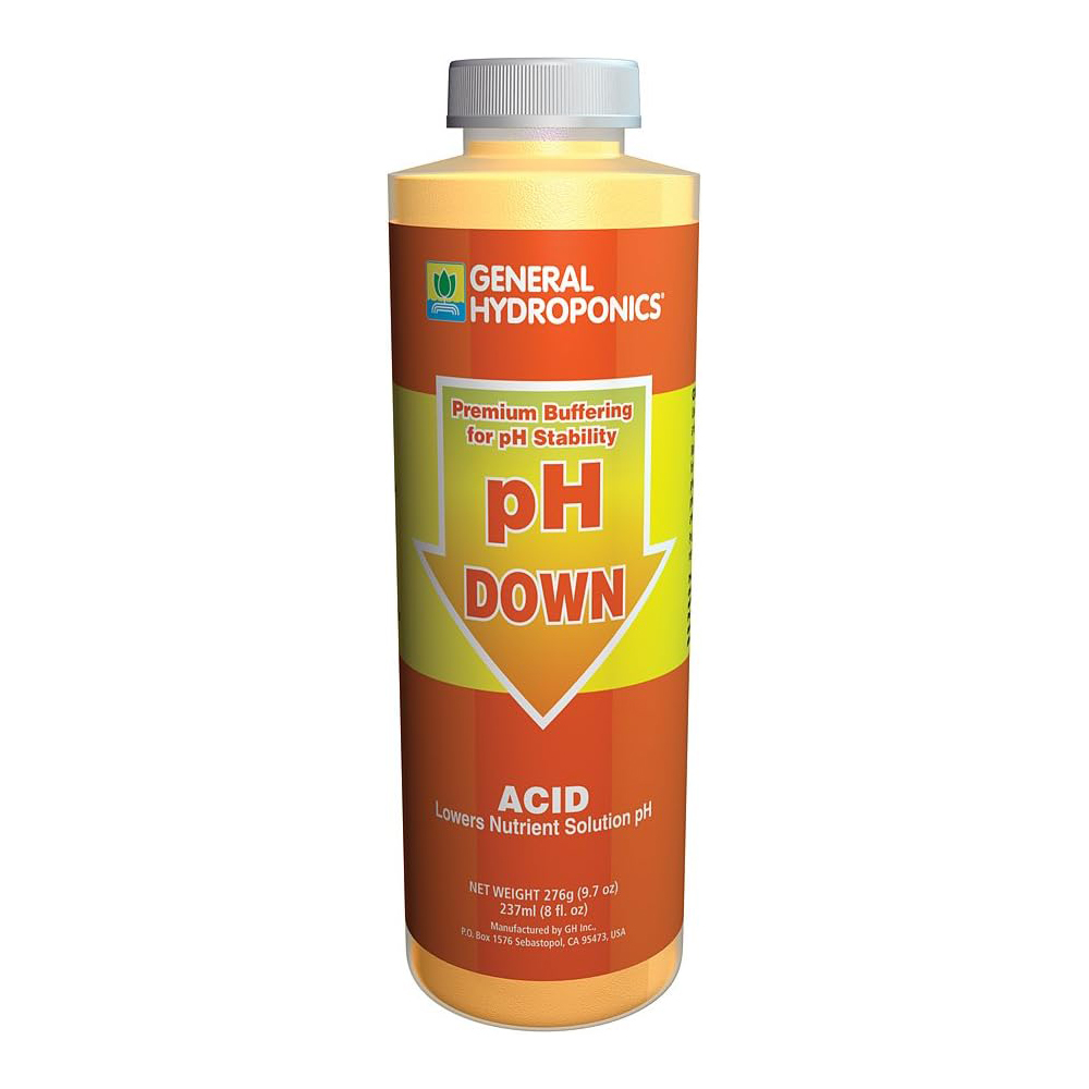 | Drip Hydro pH Down | Phosphoric acid | Very concentrated: add 0.25–1 mL at a time until the target pH | Yes Hydroponics | Larger growth/fertigation users who want tight control per dose |
