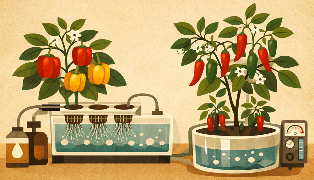 Both bell peppers and hot pepper varieties perform well in hydroponic systems; hot varieties frequently achieve more consistent capsaicin levels because of controlled environmental conditions that field production cannot match.