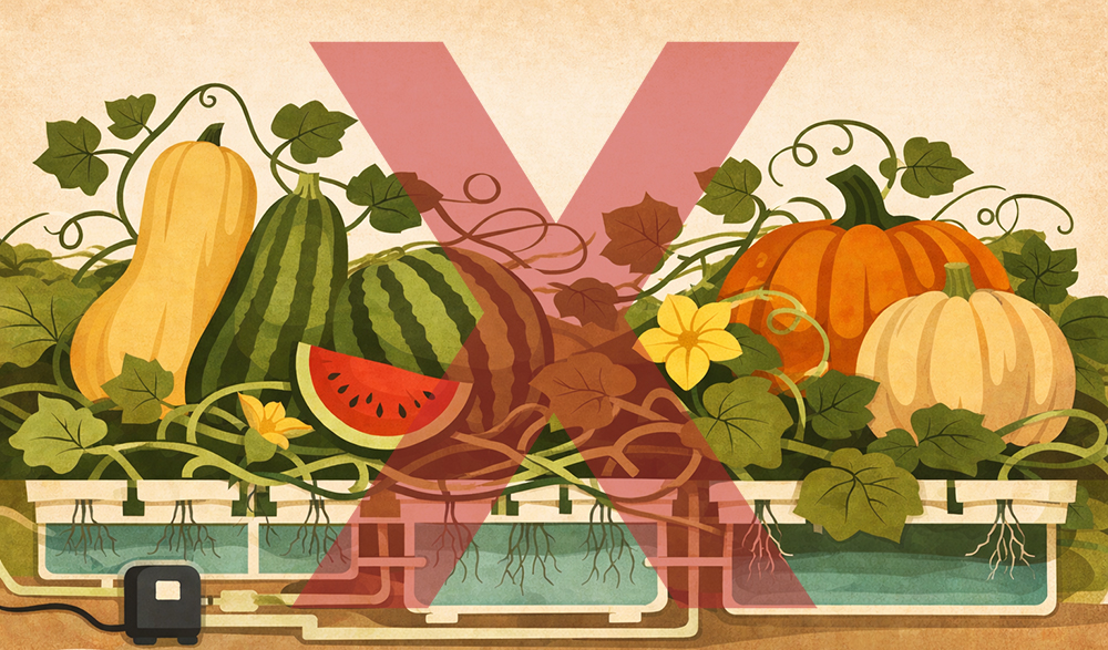 Large squash varieties, watermelons, and pumpkins all produce excessive vine growth that overwhelms almost any hydroponic system. Additionally, the weight of the fruit causes serious structural problems that require large support systems, negating the majority of hydroponic benefits.