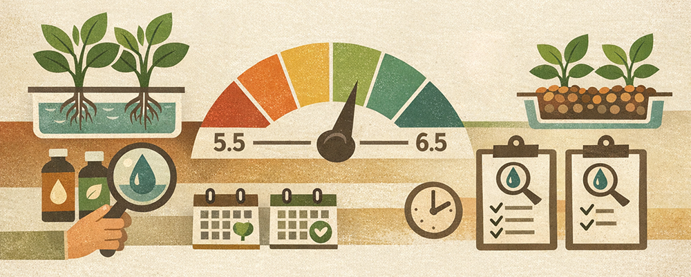 Crop preferences differ: lettuce and herbs can withstand wider ranges, but strawberries and cucumbers prefer 5.5–6.0. In general, mixed systems aim for 6.0–6.2.