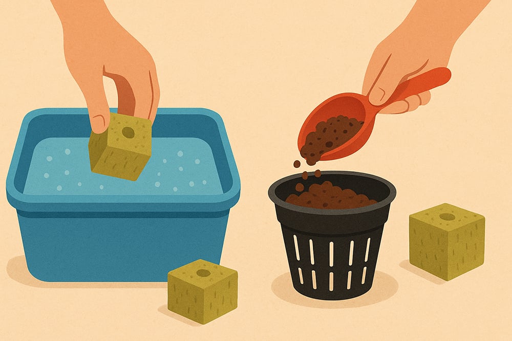 Pre-soak rockwool cubes in pH-adjusted water (5.5-6.0) to condition them for plant use. Fill net pots with your chosen medium, ensuring adequate support while maintaining proper drainage.