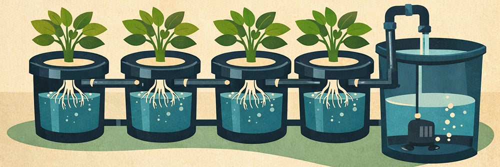 Recirculating Deep Water Culture builds on DWC by connecting multiple growing sites to a centralized control reservoir. In RDWC, individual plant containers link together via a network of tubing or pipe channels, allowing the nutrient solution to circulate continuously throughout the entire hydroponic system.