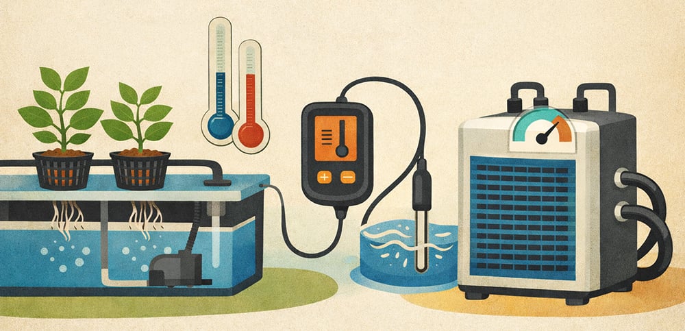 Maintaining optimal root zone temperature is essential in deep water culture hydroponics, as warm water holds less DO and increases disease susceptibility. Most plants thrive in a solution of 65-72°F (18-22°C). In DWC, each bucket’s temperature must be managed separately with a temperature sensor. If you are using smaller reservoirs, they are more likely to be susceptible to temperature fluctuations from environmental changes, potentially requiring chillers or cooling solutions for each container.