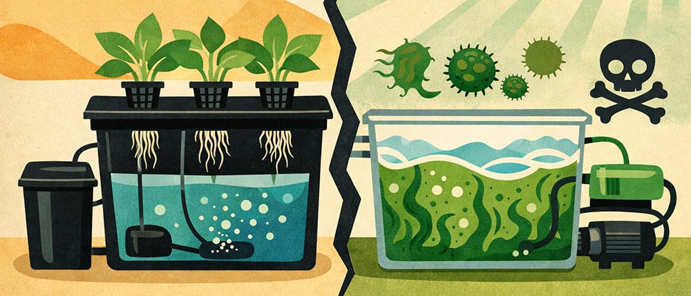Light Prevention: Keep all nutrient solution containers completely light-proof, as light exposure promotes algae growth. Algae compete for oxygen and nutrients, and can harbor pathogens.