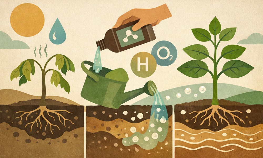 For emergency treatment of severely stressed plants, diluted hydrogen peroxide solutions (2-3 teaspoons of 3% H₂O₂ per liter of water) can be applied as a soil drench. This treatment provides both hydrogen and oxygen supplementation while helping to address anaerobic soil conditions.