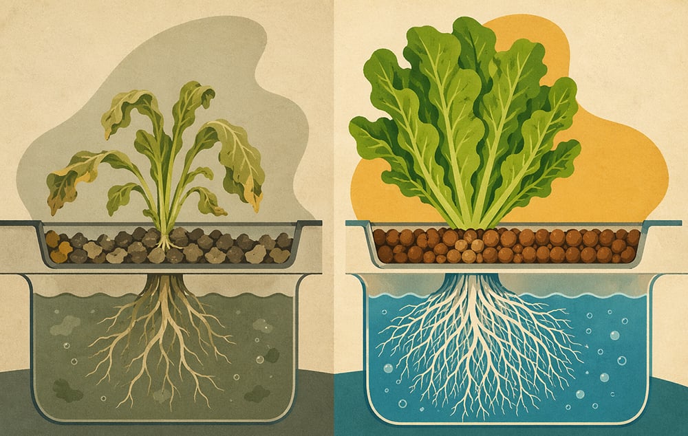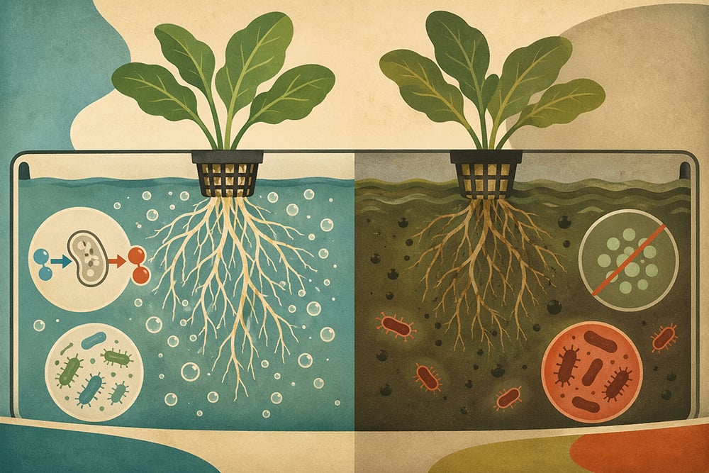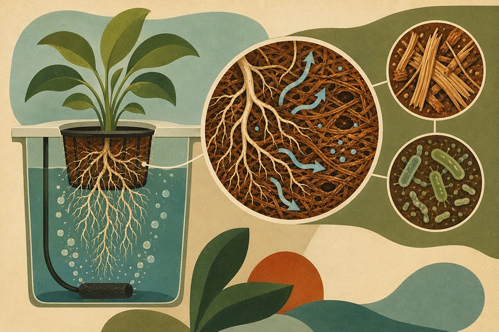 Aeration also matters because roots respire continuously, consuming oxygen and producing carbon dioxide in the process. Poor aeration in hydroponics leads to anaerobic conditions where beneficial microbes die and allow pathogens to flourish. We recommend aiming for at least 10-15% air-filled pore space, even when the material is fully saturated.