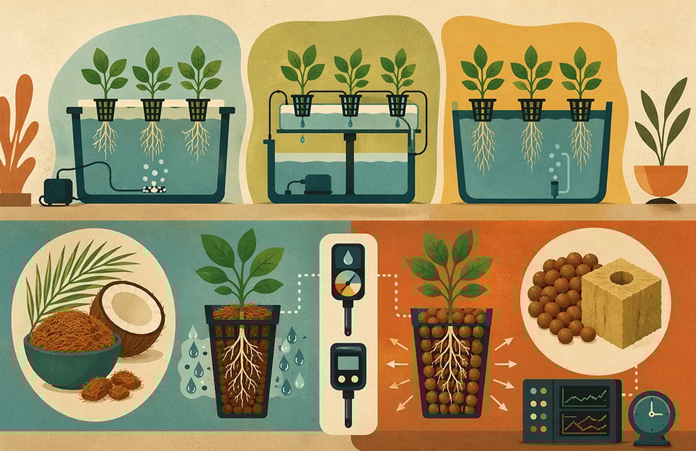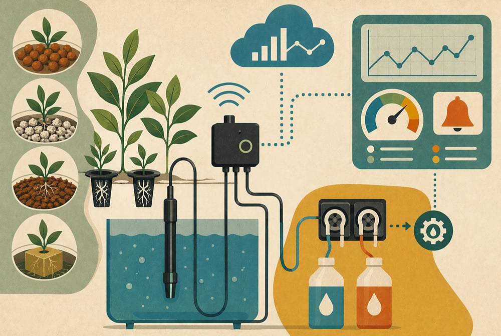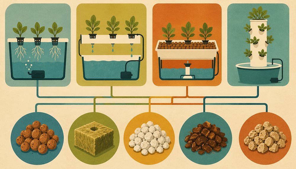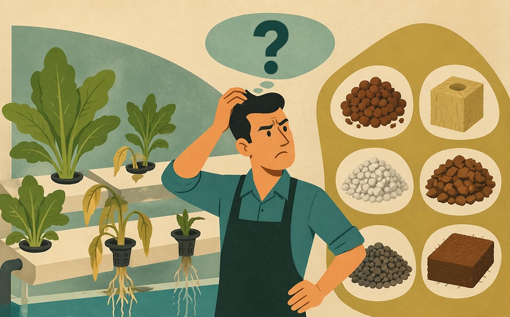 Start with your system type and crops, then choose a medium that fits your goals. For forgiveness, coconut coir offers excellent water retention and buffering, especially when paired with pH and EC monitoring. For maximum control, clay pellets or rockwool respond instantly to changes, but only with precise, continuous monitoring.
