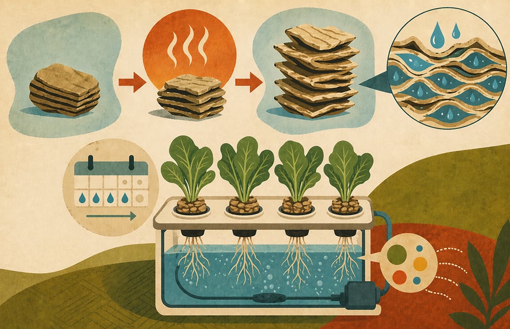 Vermiculite expands into accordion-like layers when heated, creating exceptional water retention capacity (200-300% of its dry weight). It provides moderate aeration and has a near-neutral pH level with useful CEC for nutrient retention. The fantastic moisture buffering reduces irrigation frequency, making systems more forgiving, and it retains nutrients well, releasing them gradually. Poor drainage when used alone can lead to waterlogged conditions and root rot, plus it compacts over time. Like perlite, vermiculite is typically used in blends rather than alone, particularly for seedling propagation and systems with limited irrigation control.