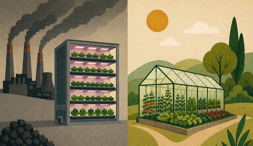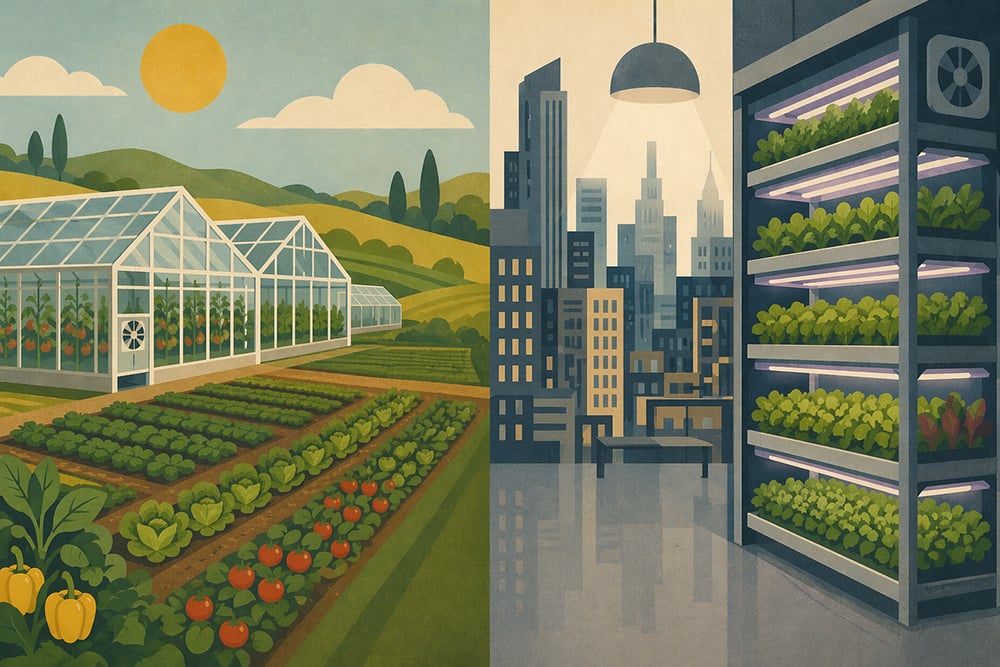 Vertical farming isn’t “better” than greenhouse farming, it’s simply different. Vertical farms maximize yield per square meter with total environmental control but high energy costs,