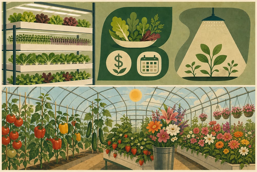 Greenhouses can economically handle a far wider variety of crops. Under greenhouse cultivation, tomatoes, peppers, cucumbers, strawberries, and cut flowers all flourish because they can take advantage of the full spectrum and intensity of natural sunlight without having to pay the energy costs associated with artificial replication. Many of these longer-cycle crops outperform vertical systems in terms of per-plant yields, and they spread infrastructure costs over longer production times.